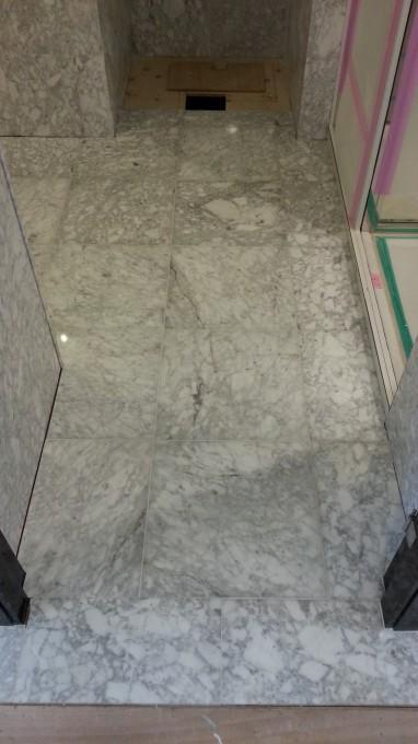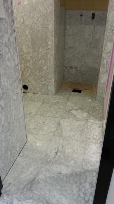 品川〇タワーのリフォームです。 高級なマンションなので中身も高級です。 今回は洗面室壁床 石貼工事です。 壁は既存の石を貼使いまわし、床は新規で類似の石を貼りました。石はロット番号や発注時期が違うだけで色味が変わってしまうので、既存を手丁寧に撤去し、貼りなおしました。