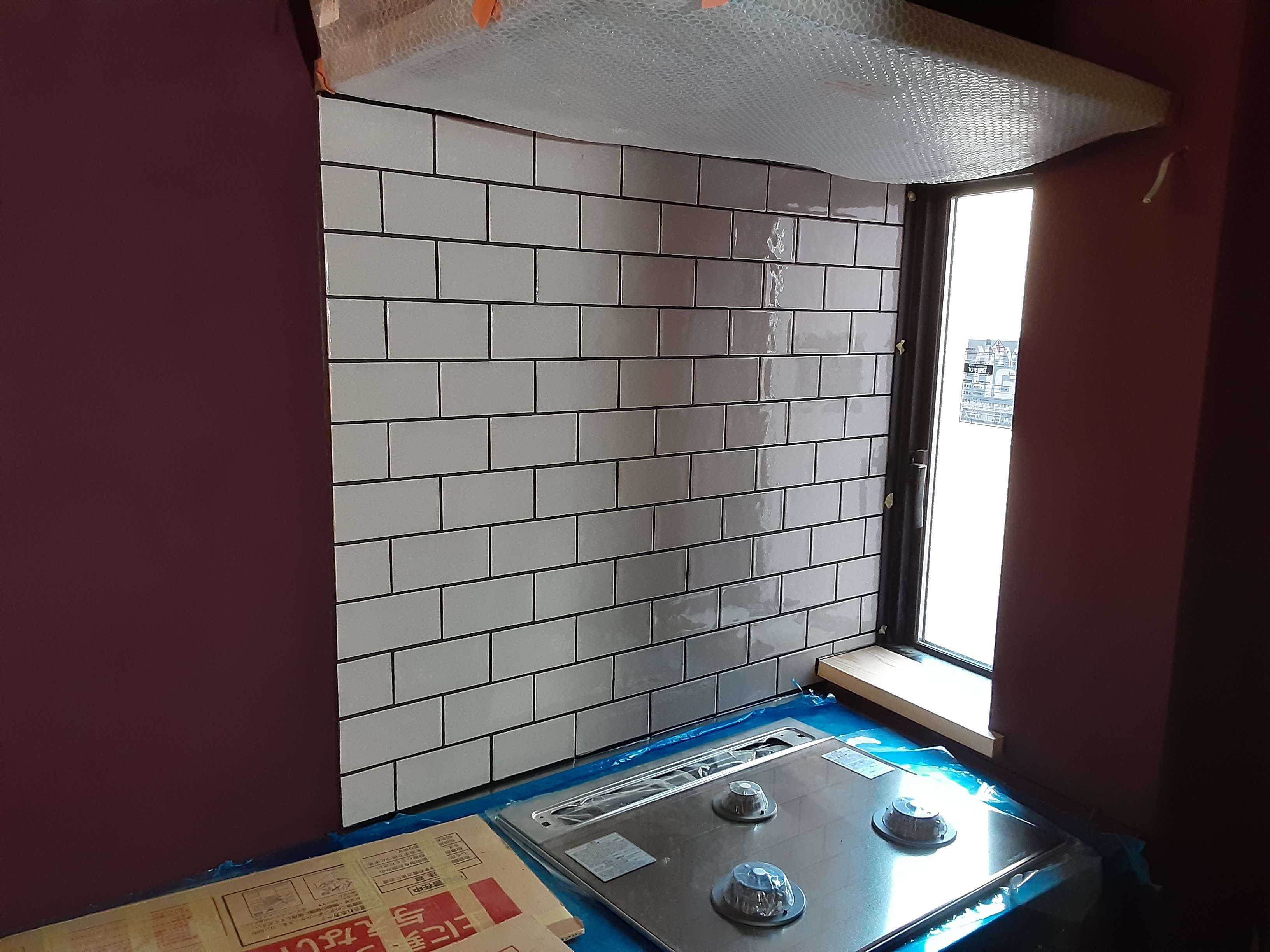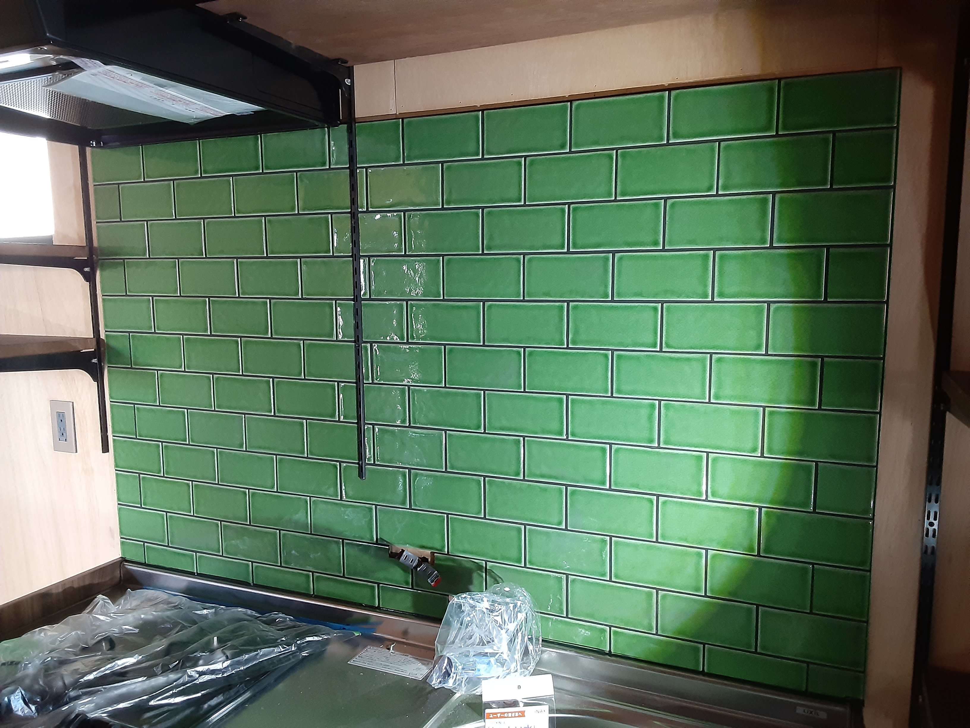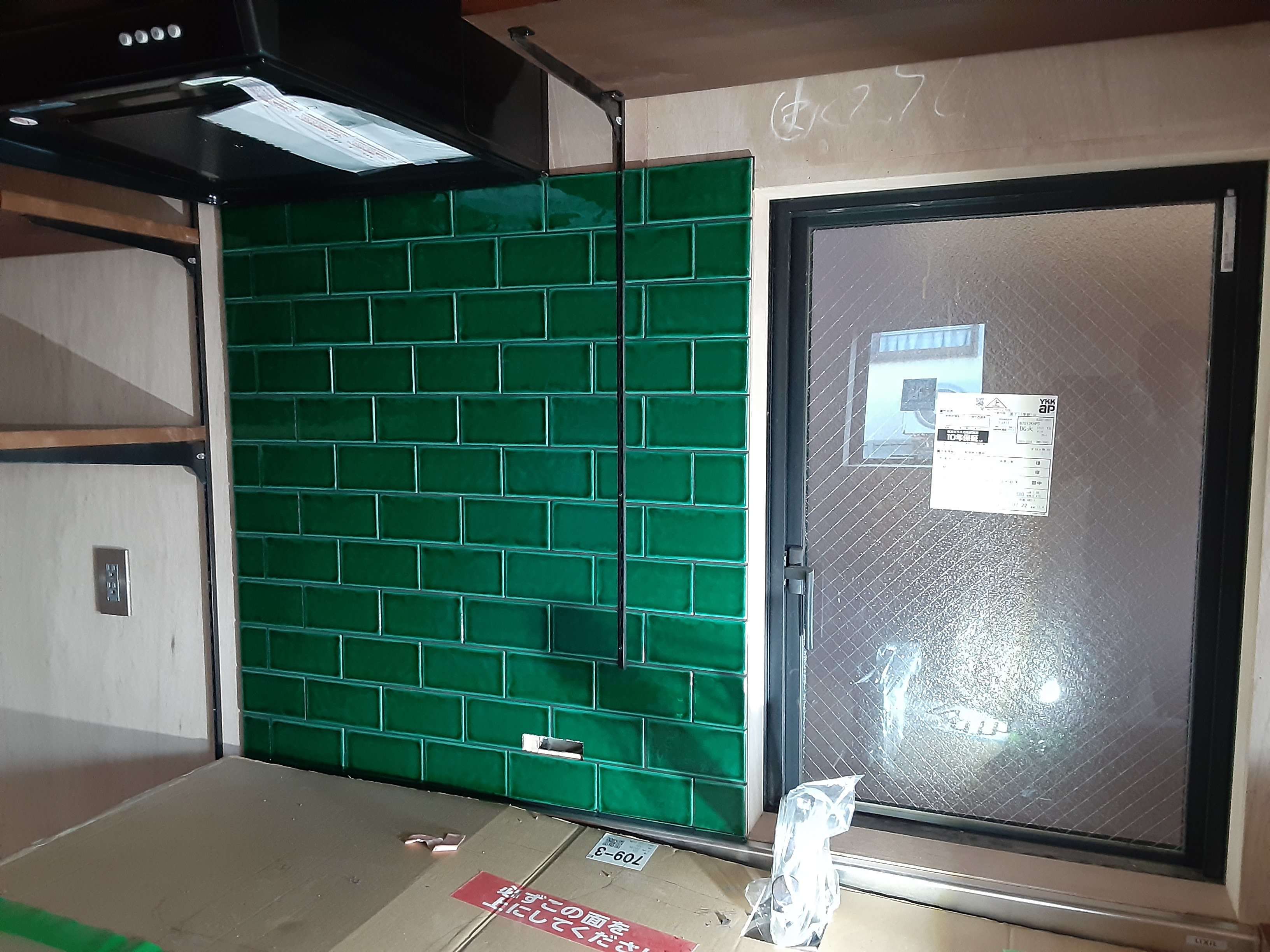 木造6世帯のアパートの各部屋のキッチン壁にタイルを貼りました。全て違う色です