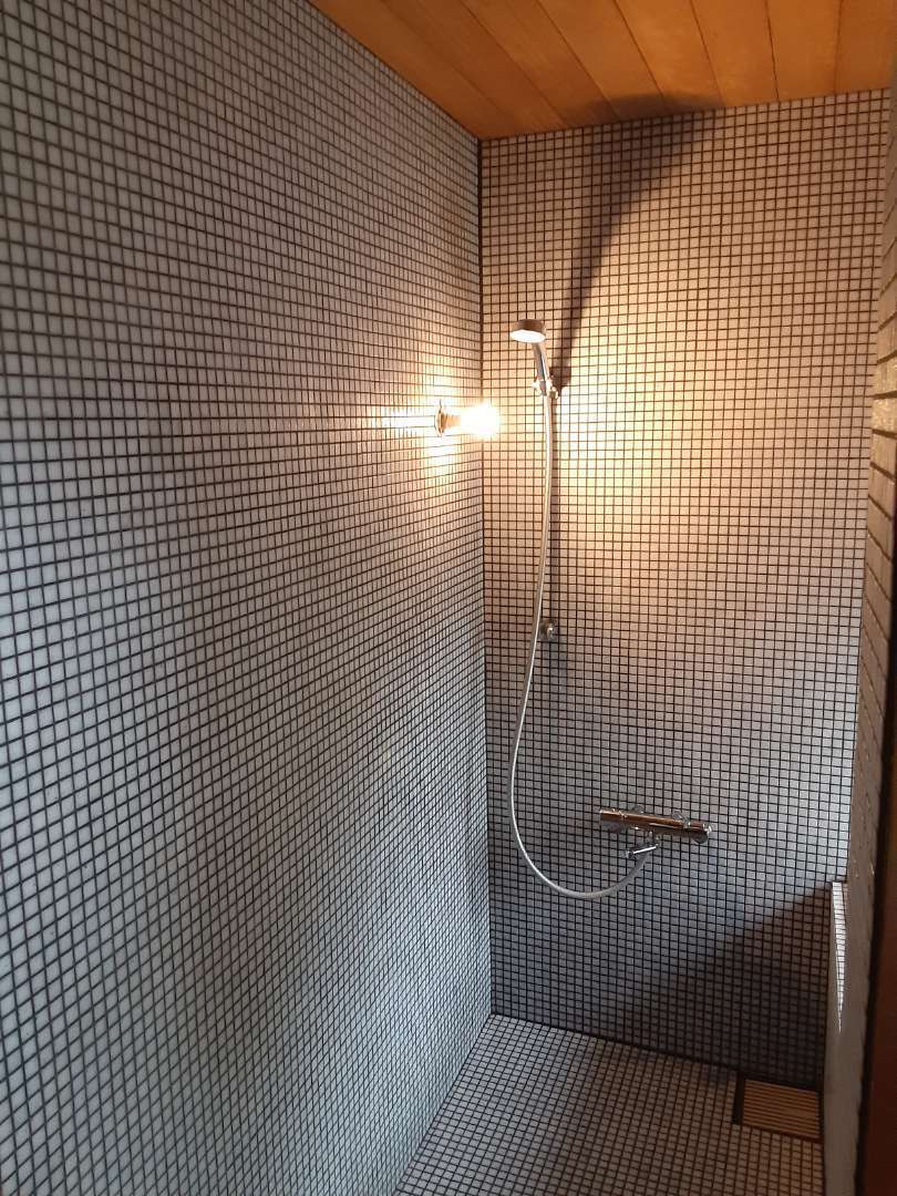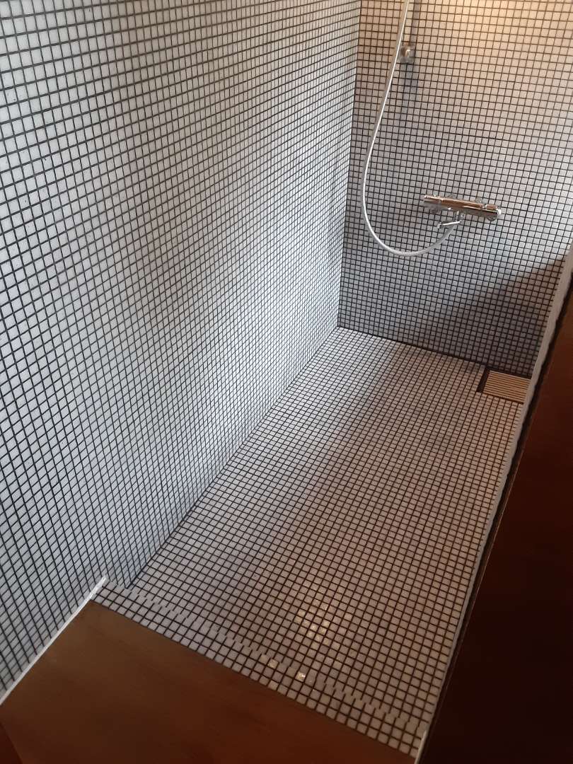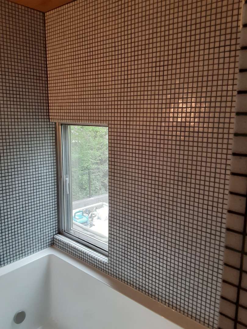 元々モルタルだった浴室にフォンてトレーディングのガラスモザイクを貼りました