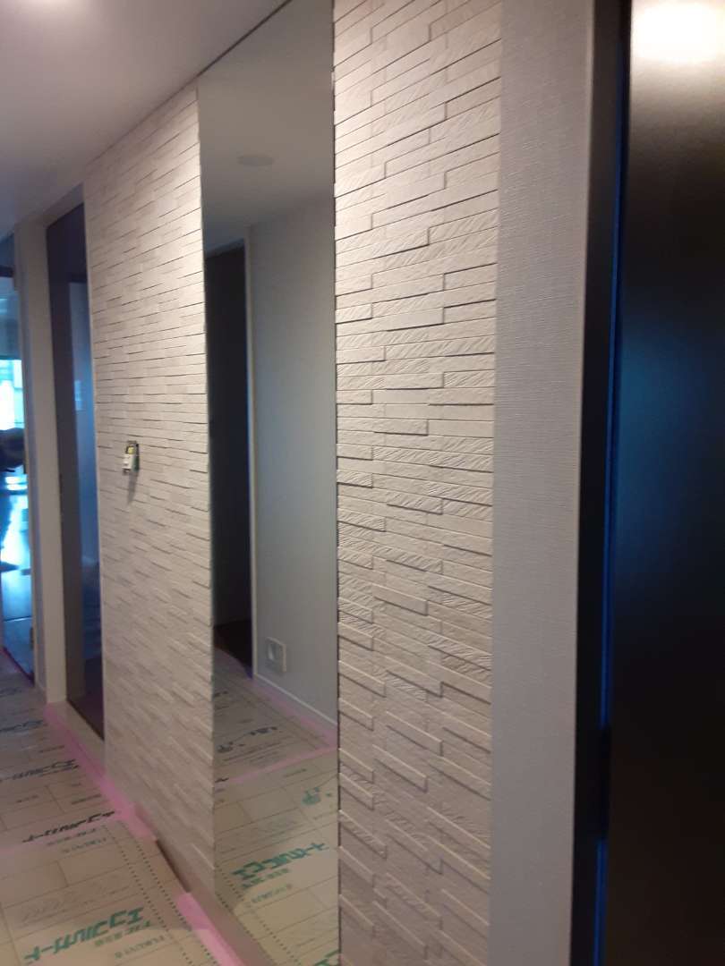 お部屋の1面にエコカラットを貼りました。 少し地味な感じですがわかりますか?