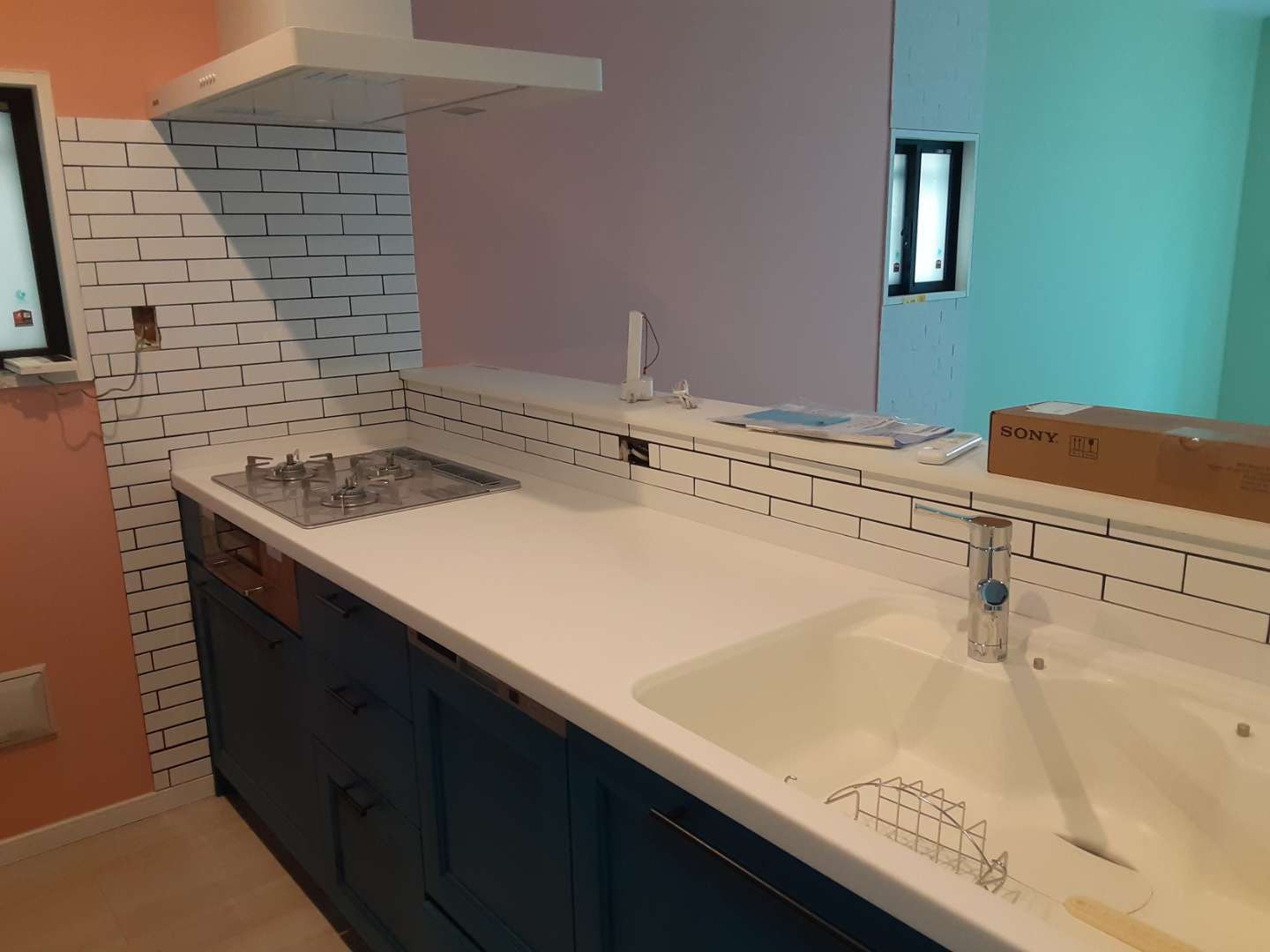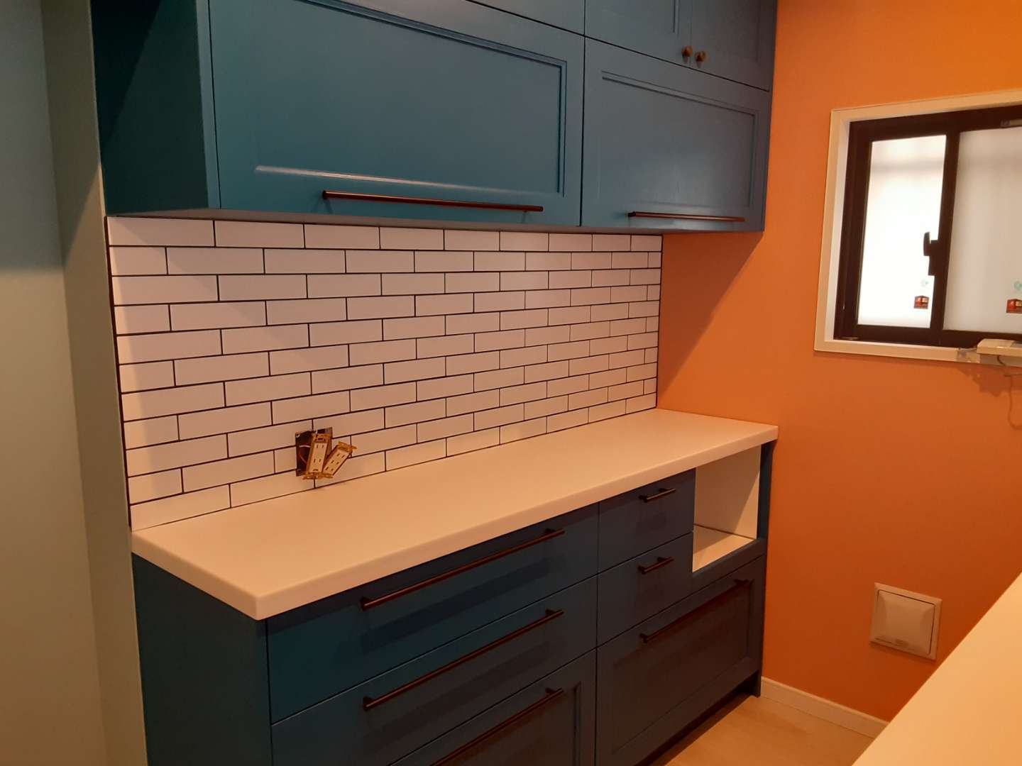 弊社はキッチン壁、カップボードにタイルを施工しました。サンワカンパニーのタイルです。