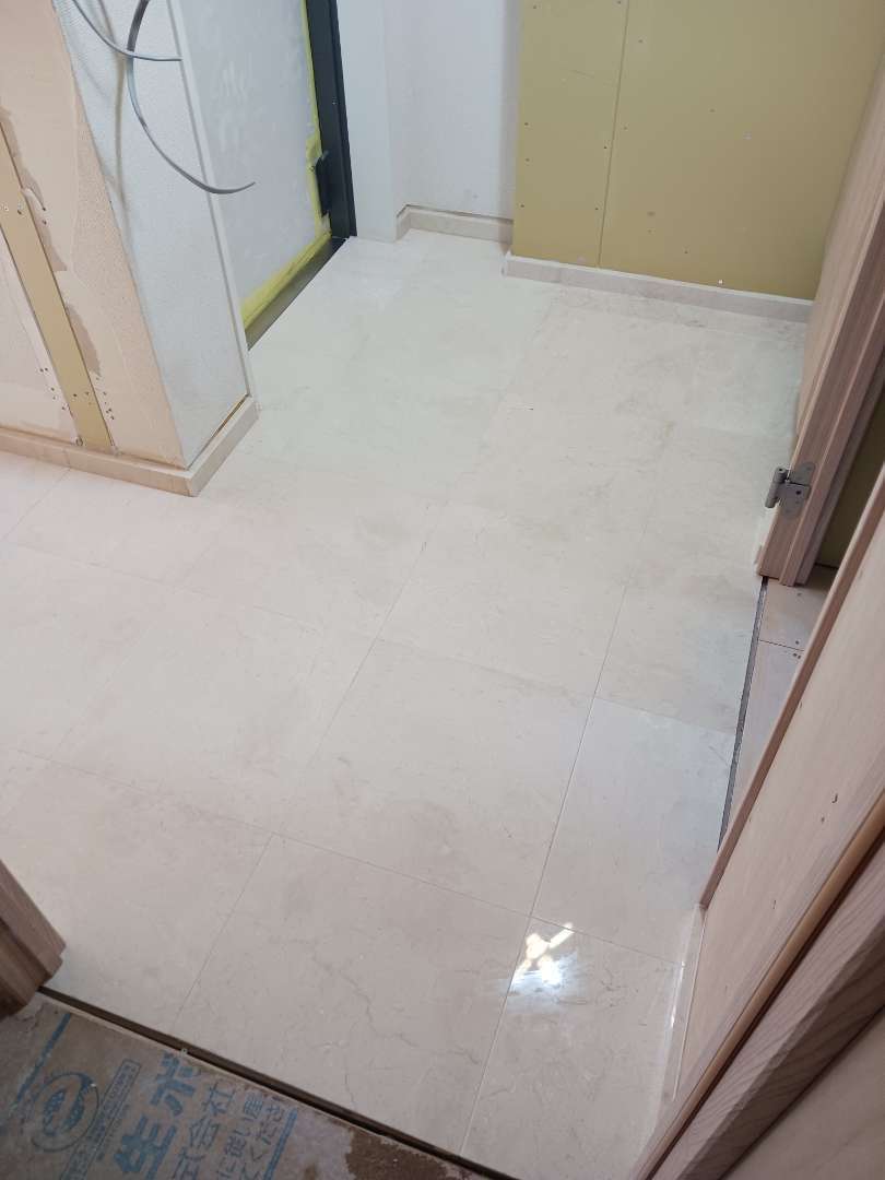 マンションリフォーム工事で、玄関、廊下床にクレママーフィルの石貼り