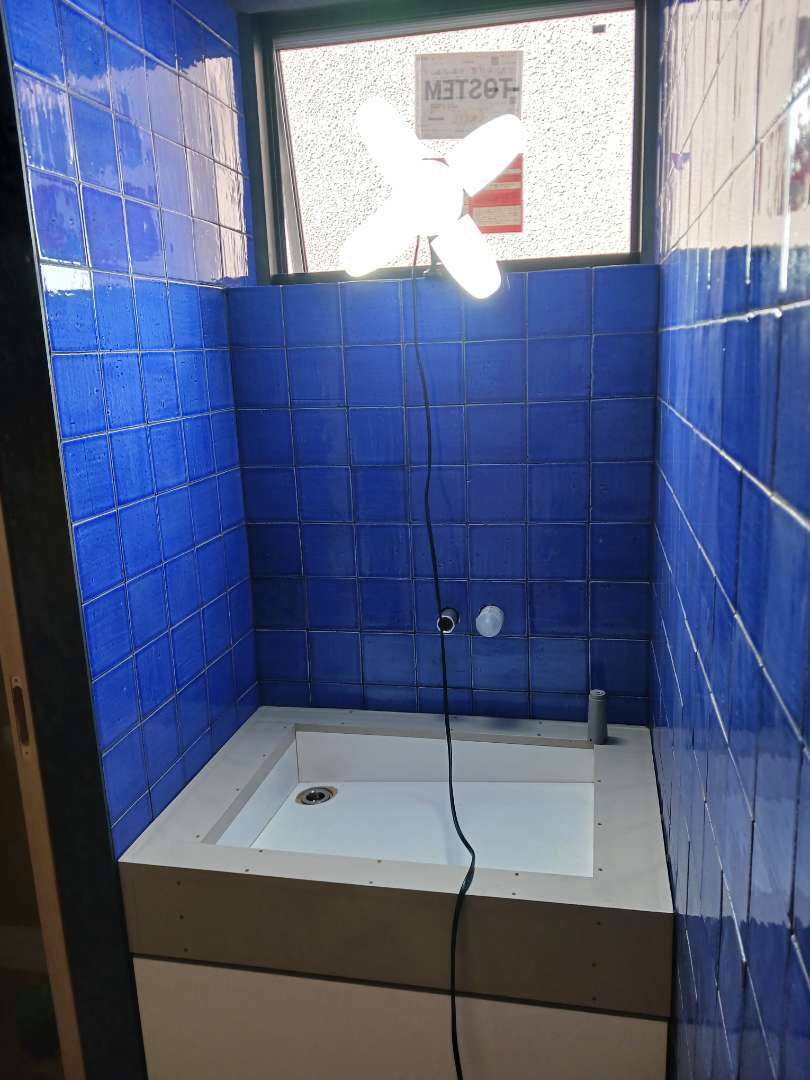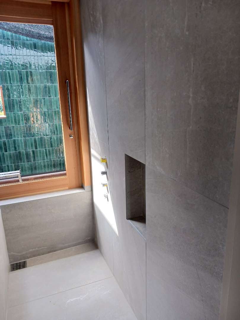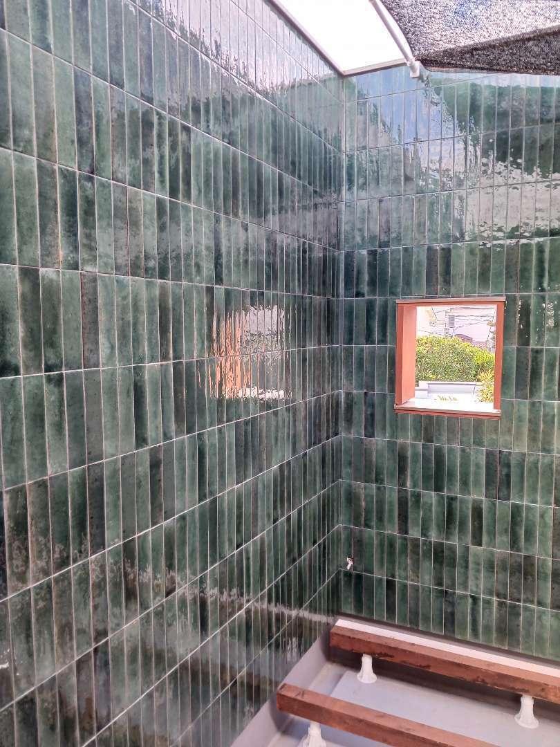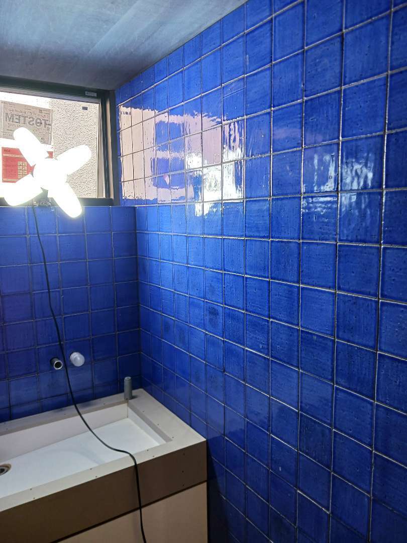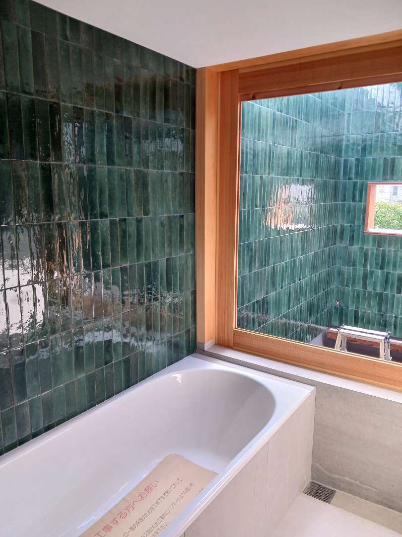 リビング壁、バルコニー壁、浴室、手洗いにタイルを施工しました。